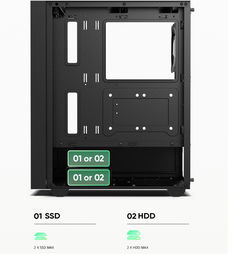 Up to 2× 3.5” HDD or 1× 3.5” HDD + 1× 2.5” SSD