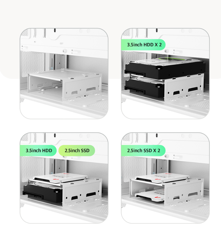 Supports up to 2 x 3.5” HDD or 1x 3.5”HDD and 1x 2.5”SSD.